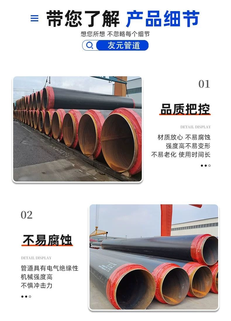 * **結(jié)構(gòu)組成**:該管道通常由鋼管基材、聚氨酯保溫層和外護(hù)層三部分組成。鋼管基材采用螺旋焊縫鋼管,通過(guò)自動(dòng)埋弧焊技術(shù)制成,具有較高的強(qiáng)度和承壓能力;聚氨酯保溫層則通過(guò)現(xiàn)場(chǎng)發(fā)泡或預(yù)制方式固定在鋼管外表面,形成連續(xù)致密的保溫層;外護(hù)層則多采用聚乙烯(PE)或玻璃鋼(FRP)等防腐耐磨材料,起到保護(hù)保溫層、防止外界環(huán)境侵蝕的作用。