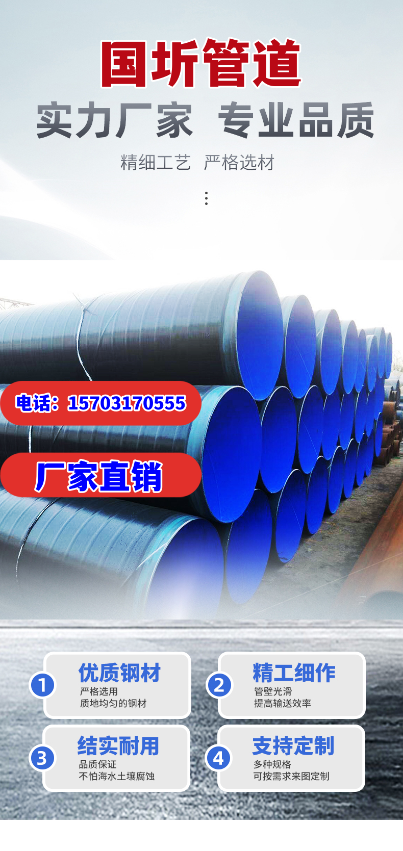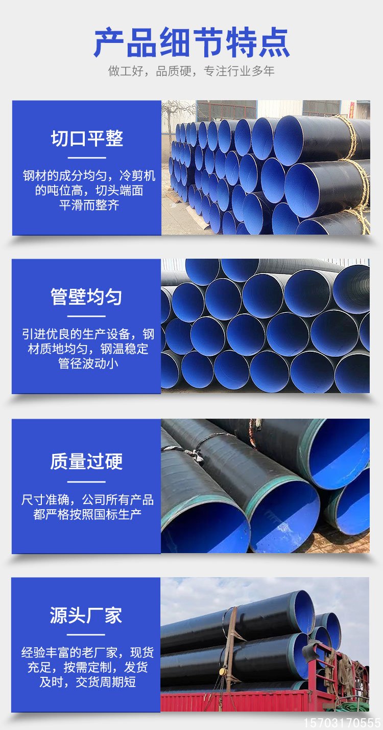 這種鋼管的防腐性能強,外層的 3PE 涂層能夠有效隔絕空氣、水分等腐蝕介質,為管道提供堅實的防護屏障;內層的環氧粉末涂層對氣體、液體等具有很高的耐久性,確保管道在長期使用過程中不受侵蝕。同時,它還具有耐高溫性能好的特點,外層 3PE 涂層能夠在高溫環境下保持較好的防腐性能和耐久性,適用于各種復雜的工業環境。