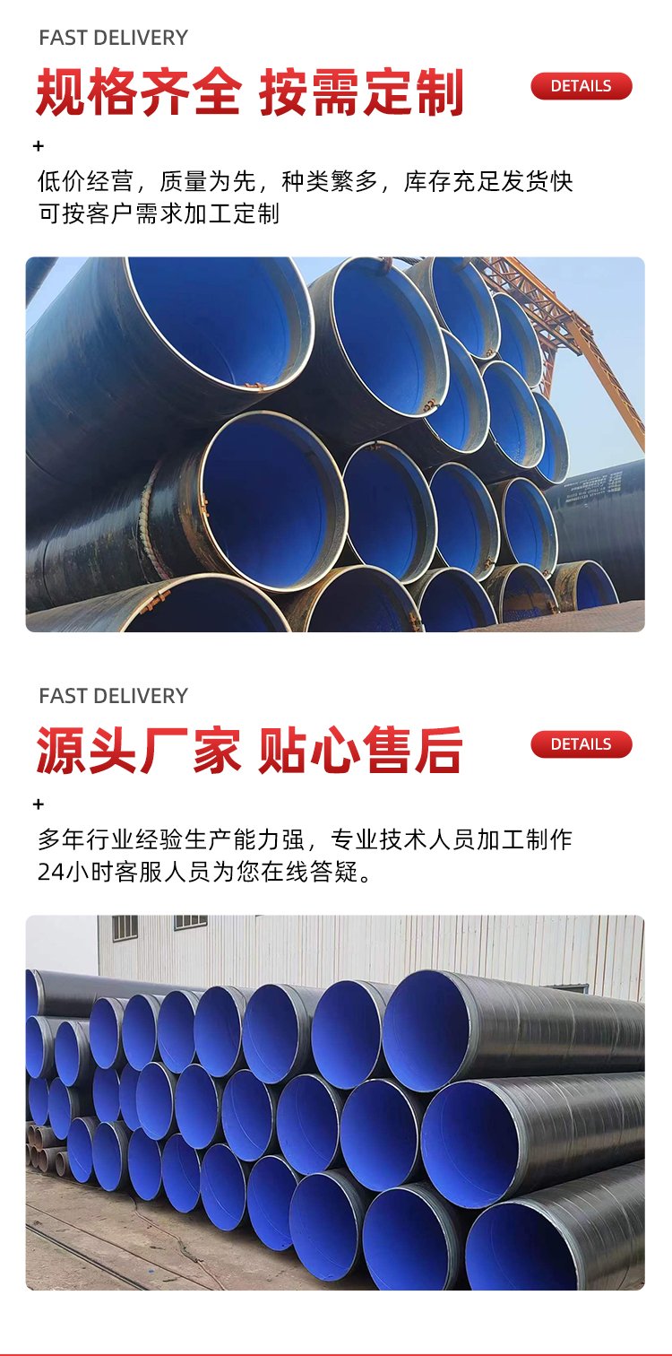 外層的 3PE 涂層在高溫環境下能夠保持防腐性能和耐久性,主要有以下幾個原因。首先,3PE 涂層中的聚乙烯材料具有較高的熔點和熱穩定性,能夠在高溫環境下保持良好的性能。其次,3PE 涂層中的粘合劑能夠在高溫環境下保持良好的粘結性,確保涂層與鋼管表面的牢固結合。此外,3PE 涂層還具有良好的隔熱性能,能夠減少外界高溫對鋼管的影響。在實際應用中,外 3PE 內環氧粉末防腐螺旋鋼管能夠在高溫環境下長期穩定運行,適用于石油、化工等高溫工業領域。
